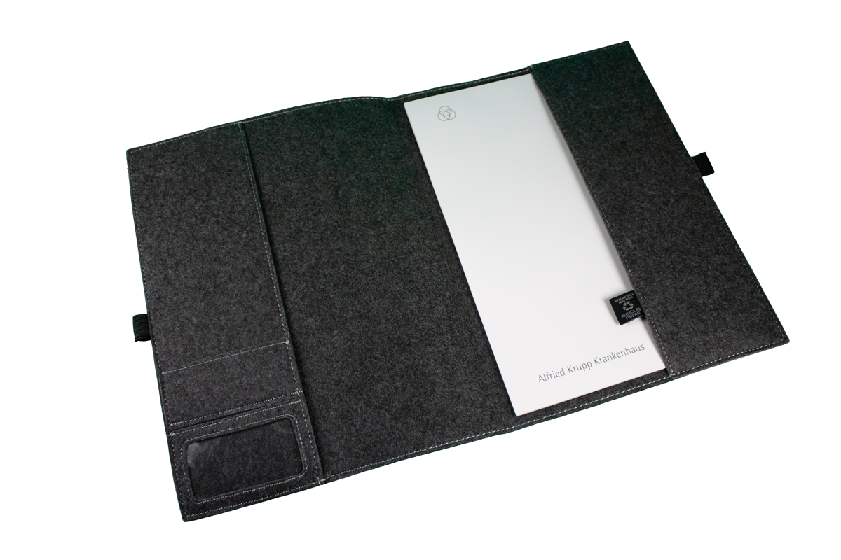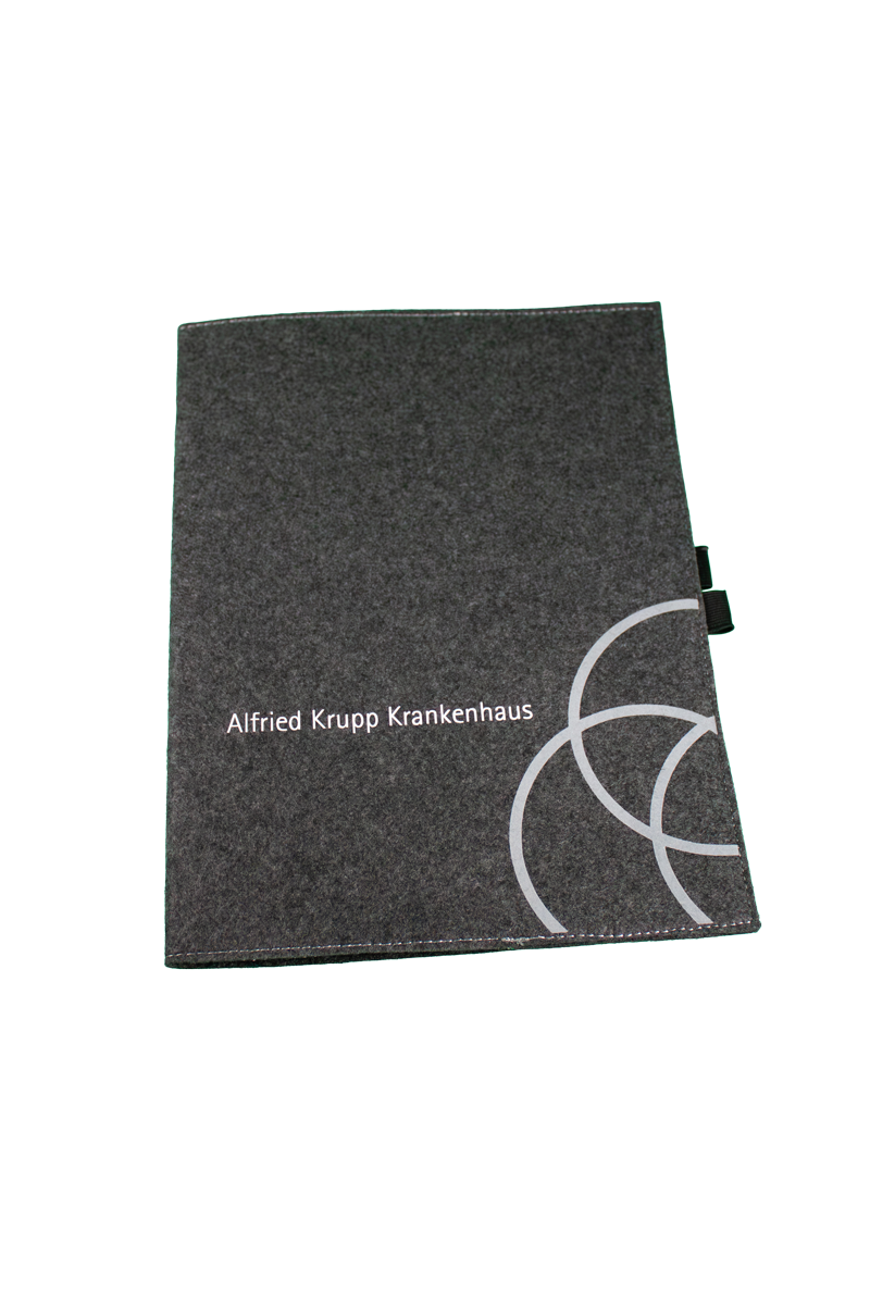 Ob im Büro, bei Meetings oder unterwegs – die Filzmappe mit Aufdruck des Alfried Krupp Krankenhauses sorgt für einen professionellen Auftritt und optimale Organisation.