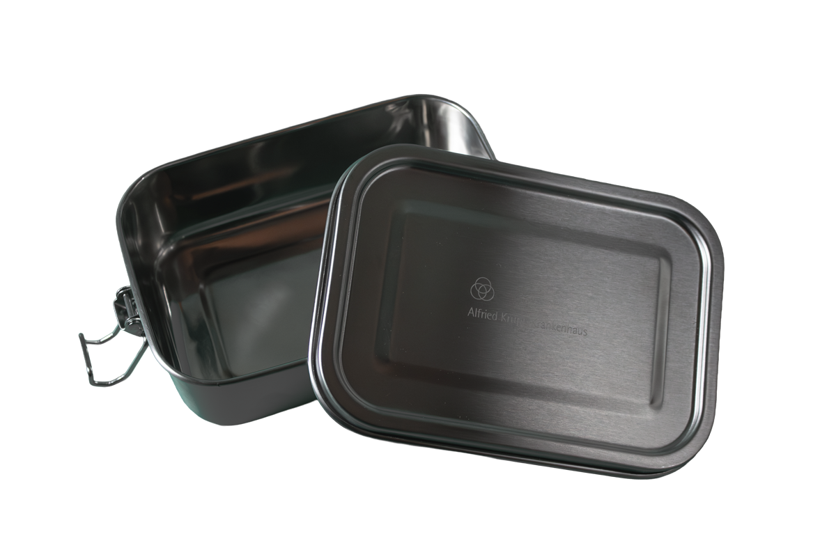 Dank des großzügigen Volumens von ca. 1.500 ml bietet sie genug Platz für abwechslungsreiche Mahlzeiten. Optional ist die Lunchbox auch mit einem flexibel einsetzbaren Trennelement erhältlich – so bleiben verschiedene Speisen sauber getrennt. Ein besonderes Highlight ist die edle Lasergravur des Alfried Krupp Krankenhauses, die der Dose eine hochwertige, persönliche Note verleiht.